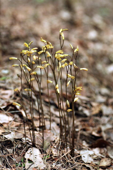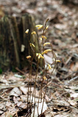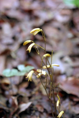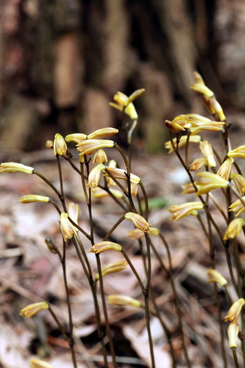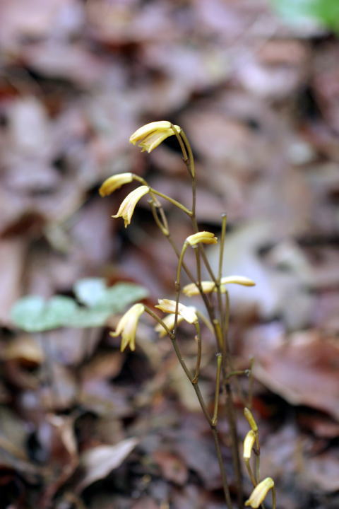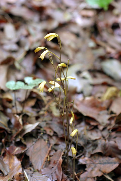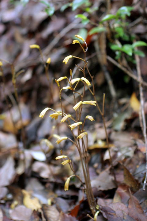 エンシュウムヨウラン ラン科ムヨウラン属 Lecanorchis kiusiana var. suginoana ウスギムヨウランの変種.唇弁の長 毛は黄色で赤紫色を帯びない。 山地のやや暗い林床などに生える 高さ15〜30cmの腐生ラン。 5〜6月. 花茎の上部に黄渇色の小 さな花を3〜6個つける。 和名は最初の発見地、遠州(静岡 県)に由来する。 愛知県のある峠付近では300個体 以上が自生していた。 ![]() 愛知県 2008.6.1 画像をクリック ![]() 埼玉県 2009.6.4 画像をクリック ![]() 埼玉県 2009.6.4 画像をクリック ![]() 埼玉県 2012.6.2 画像をクリック ![]() 埼玉県 2012.6.2 画像をクリック トップページへ 前ページへ |