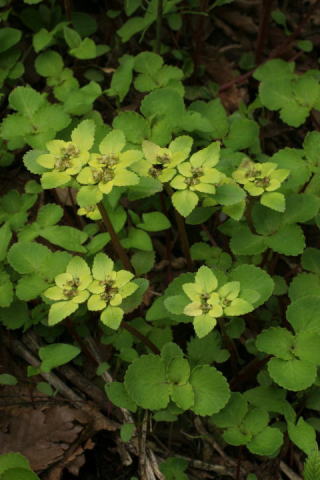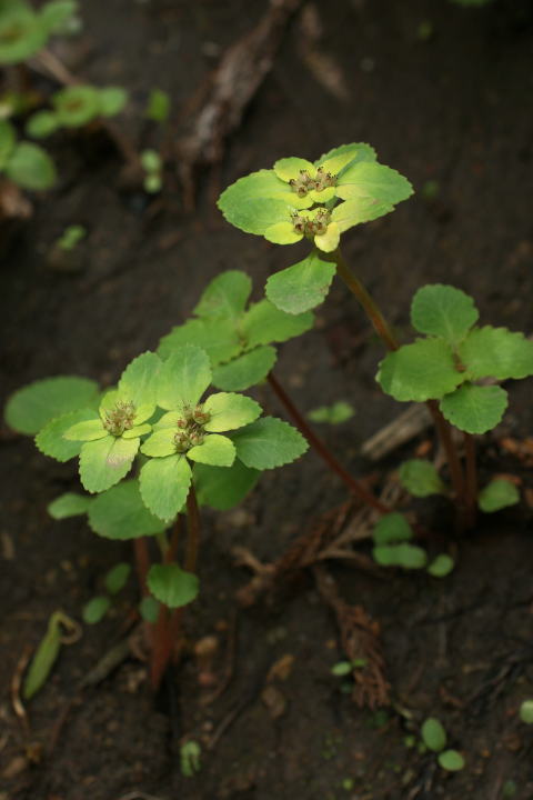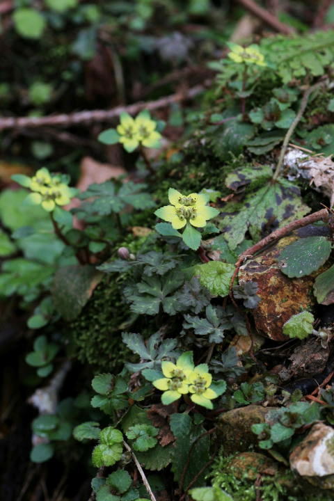 ホクリクネコノメ ユキノシタ科ネコノメソウ属 Chrysosplenium fauriei 新潟〜島根の日本海側に分布 山地の林内や湿り気のある所に生える 高さ10cm前後の多年草。 葉はないか1対の葉を対生、 根出葉は 花時まで残っており、円形で緑色。 ふちには10対ほどの鈍鋸歯がある。 苞葉は淡黄色、 雄蕊は8個で、葯は暗 紅紫色をしている。 イワボタンに似るが、 根出葉が細長い ので、円形の本種とは区別できる。 群馬県には自生していない。 ![]() 新潟県 2008.5.1 画添をクリック ![]() 新潟県 2010.3.20 画添をクリック トップページへ 前ページへ |