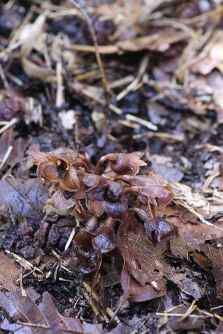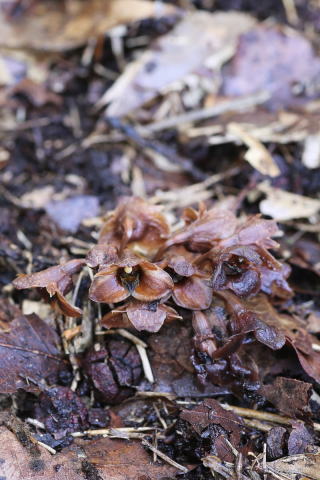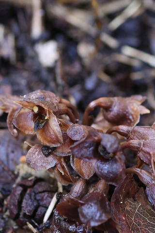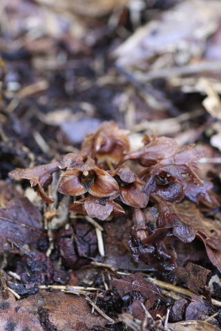 クロヤツシロラン ラン科オニノヤガラ属 Gastrodia pubilabiata 福島県以南・四国・九州に分布 丘陵地や山地の林内などに稀に生える 小型の腐生ラン。 アキザキヤツシロランに似るが、唇弁基 部のいぼ状突起にこぶ状の毛があるこ と、地表すれすれで咲くなど異なる。 イモ状の塊茎から新芽をだし、1〜数個 の花茎を伸ばす。 花茎は地上部では高さ1〜2cmとほとん ど伸びず.膜質鱗片がある。 9〜10月.茎頂に直径約1cmの茶褐色の 花を数個束生状につける。 萼は長さ約1cm. 外側はやや平滑.側花 弁と共に平開する。 これまで、伊東、鎌倉. 八王子の産地を 何度も訪れたが、出会えずにいた。 伊東は高く伸びた果実を確認. 2年つづ けて訪れたが、発見できなかった。 今回は湘南の植物に精通しているグル ープにご案内いただき、念願が叶う。 初めて見る植物は アラカシ.マダケ.イヌ シデなどの混生林に散生していた。 100m程離れた竹林 (モウソウ)にはアキ ザキヤツシロランも見られる。 2024年9月23日.友人夫妻が.群馬県初 の自生地を見つけた。 2024年10月6日. 友人kさんと.筆者は群 馬県第2の産地を発見する。 ![]() (唇弁は有毛) 神奈川県 2006.10.4 画像をクリック ![]() 800×1200 根茎(下)と根状器官(上) 神奈川県 2006.10.4 画像をクリック ![]() (未熟果) 神奈川県 2006.10.4 画像をクリック ![]() 神奈川県 2013.9.29 画像をクリック ![]() 神奈川県 2013.9.29 画像をクリック ![]() (色彩変異) 神奈川県 2013.9.29 画像をクリック ![]() (種子が覗く果実) 埼玉県 2017.11.22 画像をクリック ![]() (結実個体) 埼玉県 2017.11.22 画像をクリック ![]() 埼玉県 2018.9.28 画像をクリック ![]() (唇弁は有毛/アキザキヤツシロランの唇弁は無毛) 埼玉県 2018.9.28 画像をクリック ![]() (唇弁は有毛) 埼玉県 2018.10.7 画像をクリック ![]() 埼玉県 2022.10.1 画像をクリック ![]() (リンクは800×1200) 埼玉県 2023.10.11 画像をクリック ![]() 埼玉県 2023.10.11 画像をクリック ![]() 埼玉県 2023.10.11 画像をクリック ![]() (群馬県第1の産地) 群馬県 2024.9.25 画像をクリック ![]() 群馬県第1の産地 (リンクは800×1200) 群馬県 2024.9.25 画像をクリック ![]() (群馬県第1の産地) 群馬県 2024.9.25 画像をクリック ![]() (群馬県第2の産地) 群馬県 2024.10.6 画像をクリック ![]() (群馬県第2の産地) 群馬県 2024.10.6 画像をクリック ![]() (群馬県第2の産地) 群馬県 2024.10.12 画像をクリック ![]() (群馬県第2の産地) 群馬県 2024.10.12 画像をクリック ![]() 群馬県第2の産地) 群馬県 2025.10.12 画像をクリック ![]() (群馬県第2の産地) 群馬県 2025.10.17 画像をクリック ![]() (群馬県第2の産地) 群馬県 2025.10.17 画像をクリック トップページへ 前ページへ |