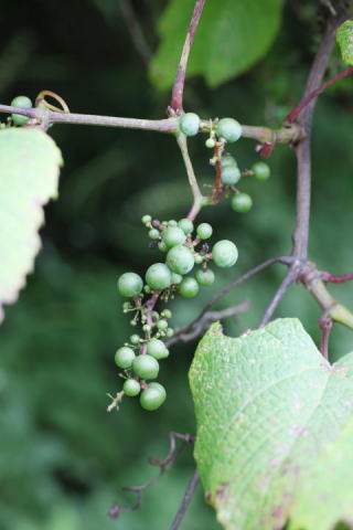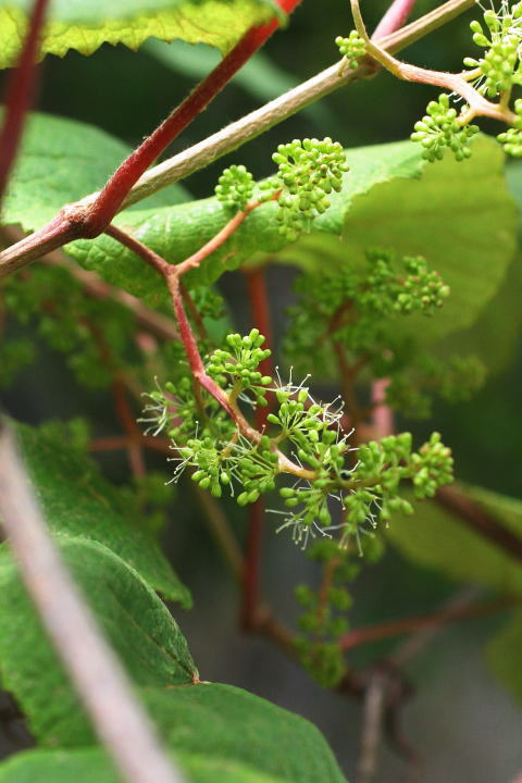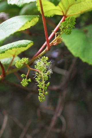 ヤマブドウ ブドウ科ブドウ属 Vitis coignetiae 山地の林内や沢沿いなどに生える 落葉つる性木本。 葉が互生、葉身は五角状円心形で、 浅く3裂し、縁には鋭鋸歯がある。 6〜7月、円錐花序をだし、黄緑色の 小さな花を多数つける。 9〜10月、はじめ緑色、熟すと紫黒 色の液果をつける。 仲間にエビヅルやサンカクヅルなど があり、いずれも食べられる。 八ヶ岳・浅間山・佐久高原には多い。 ![]() 長野県 2007.6.28 画像をクリック ![]() (未熟果) 長野県 2013.8.7 画像をクリック ![]() (果実) 長野県 2013.9.24 画像をクリック トップページへ 前ページへ |