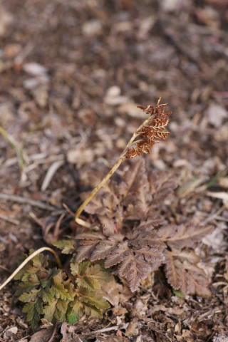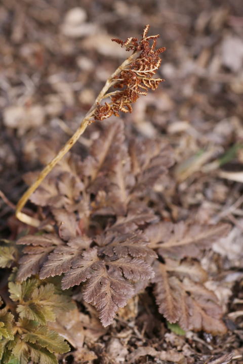 アカハナワラビ ハナヤスリ科ハナワラビ属 Botrychium nipponicum 宮城県以南、四国、九州に分布 向陽の山地林下等に生える長さ10〜20cm の冬緑性の小型シダ。 栄養葉は3出複葉で、 3回羽状分岐、羽片 には長い柄があり.小羽片の先端は鋭い。 胞子葉は栄養葉よりはるかに長く. 胞子が 飛散したあとは枯死する。 胞子の外膜は微細なうね状隆起が網目を つくるほかはほぼ平滑。 フユノハナワラビやオオハナワラビに似て いるが.本種は冬季に葉が紅変する。 実家裏山のお堂周辺に群生していた。 ![]() 埼玉県 2007.2.25 ![]() 群馬県 2007.12.3 画像をクリック ![]() 群馬県 2017.1.3 画像をクリック ![]() 群馬県 2023.2.1 画像をクリック ![]() 群馬県 2023.12.24 画像をクリック ![]() 群馬県 2026.2.13 画像をクリック トップページへ 前ページへ |